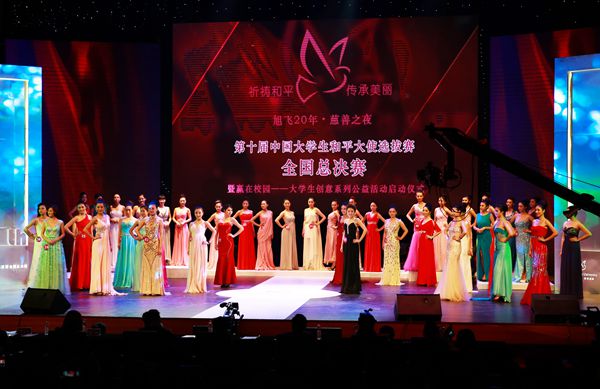 2013年11月23日晚,由联合国教科文组织所属世界大学校长国际联合会(IAUP)倡导发起,中国文化促进会、中国社会福利基金会等单位主办,中国传媒大学艺术学部承办的“第十届(2013)中国大学生和平大使选拔赛全国总决赛暨赢在中国-大学生创意系列公益活动启动仪式”在我校综合实验楼1500人报告厅隆重举行。著名导演李少红、著名音乐人郭峰、著名演员岳红、国际超模黄超燕、节目主持人曹涤非等多位行业知名人士担任比赛评委,著名演员张静初担任大学生和平大使慈善基金形象大使。比赛中,来自中国传媒大学、浙江大学、外交学院、西南大学等17所高校的44名优秀女大学生,通过青春活力装、学士服、民族服饰、环保主题服装以及晚装等环节的激烈角逐,最终,我校播音主持艺术学院2010级播音与主持艺术专业的吴梦瑶同学荣获冠军,外国语学院2013级日语专业的李祎璇同学获得亚军,2011级播音与主持艺术专业的徐溟旭同学获得最佳国际风范奖。本届活动的冠、亚、季军将于2014年1月代表中国前往韩国参加第27届世界大学生和平大使选拔赛总决赛。